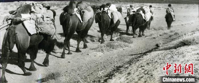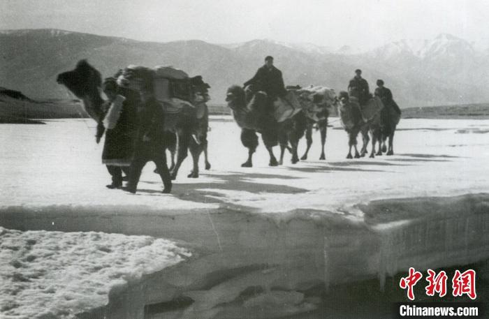 資料圖為1953年11月,西藏運(yùn)輸總隊(duì)駝工往西藏徒步運(yùn)輸物資。 中新社發(fā) 莫河駱駝場歷史陳列館 供圖