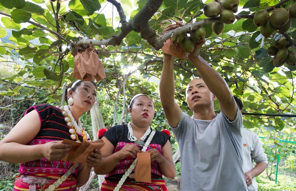 在察隅縣下察隅鎮(zhèn)京都村,管理員高峰(右)在指導當?shù)卮迕窠o獼猴桃果實套紙袋(2012年7月22日攝)。 新華社記者金立旺 攝