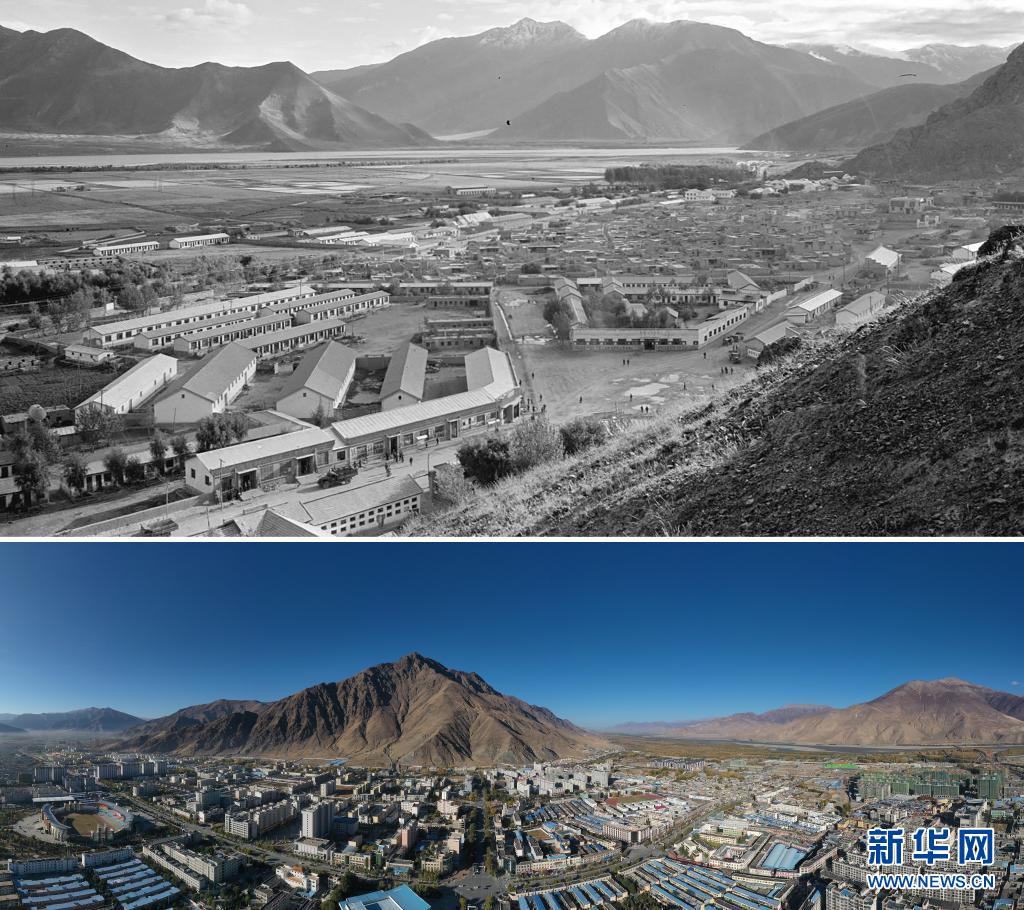 拼版照片:上圖是20世紀(jì)70年代的西藏山南地區(qū)澤當(dāng)鎮(zhèn)景象(新華社記者顧綬康攝);下圖是2020年11月26日拍攝的山南澤當(dāng)鎮(zhèn)風(fēng)貌(新華社發(fā) 次仁龍布攝,無人機照片)。新華社發(fā)