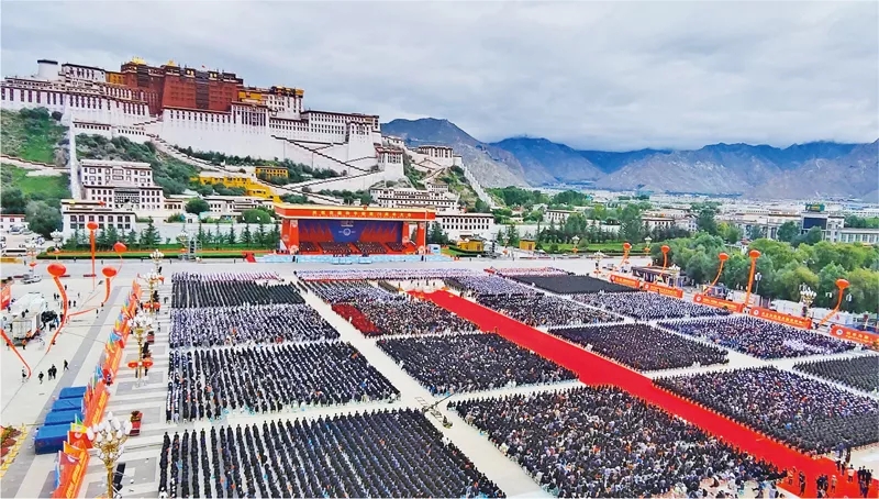 2021年8月19日,西藏各族各界干部群眾2萬多人歡聚在拉薩布達(dá)拉宮廣場(chǎng),熱烈慶祝西藏和平解放70周年。新華社記者 孫瑞博/攝
