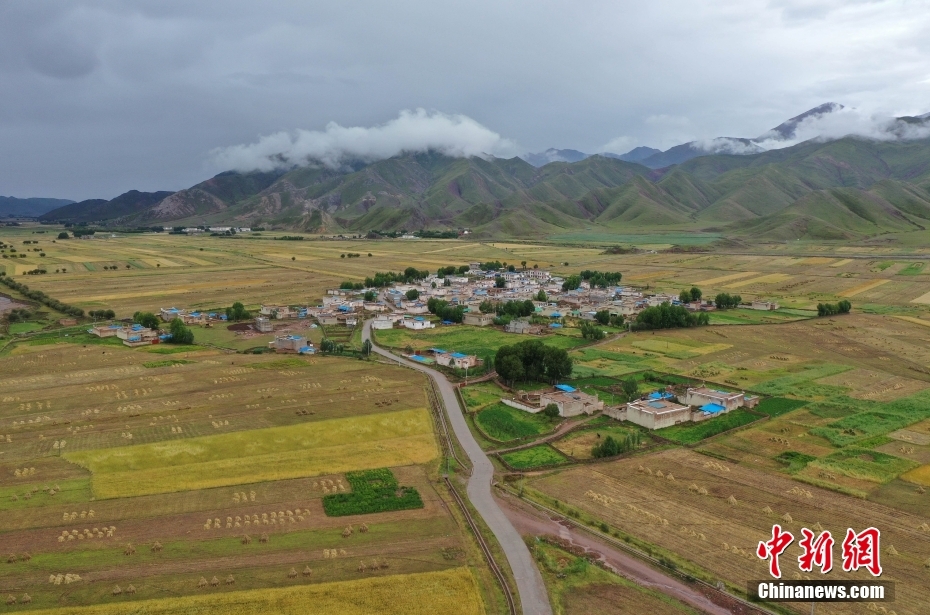 9月8日,西藏自治區(qū)拉薩市林周縣境內的田野美景。金秋時節(jié),拉薩河谷一帶青稞成熟,呈現(xiàn)豐收美景。(無人機照片)中新社記者 貢嘎來松 攝