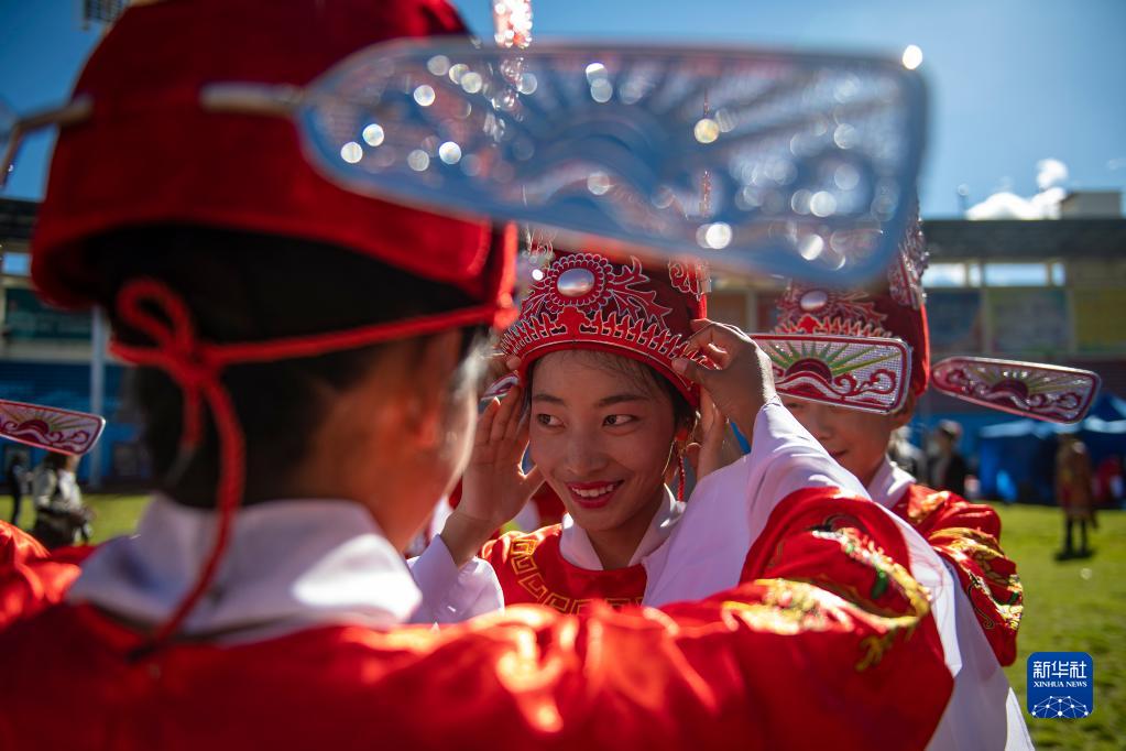 9月13日,參加2021雅礱文化旅游節(jié)開幕式文藝演出的山南市第二高級中學學生登臺前整理服裝。新華社記者 孫瑞博 攝