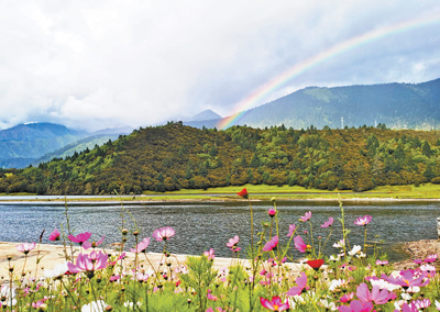 牧民騎馬穿行在花海中,遠處的高山在繚繞的云霧中若隱若現(xiàn),炊煙裊裊,清風送來田間青稞的香氣。