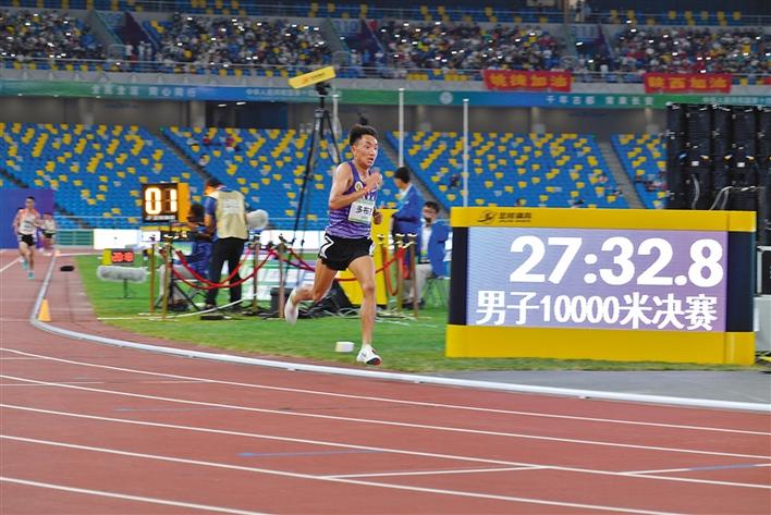 在同日進(jìn)行的田徑項(xiàng)目男子10000米決賽中,西藏自治區(qū)選手多布杰、索朗才仁、旦木真次旺參賽。經(jīng)過激烈鏖戰(zhàn),多布杰以28分35秒24的成績(jī)力壓群雄,勇奪冠軍,為西藏奪得本屆全運(yùn)會(huì)第二金,蟬聯(lián)兩屆全運(yùn)會(huì)該項(xiàng)目的冠軍。旦木真次旺和索朗才仁分別獲得了第四、第七名的好成績(jī)。