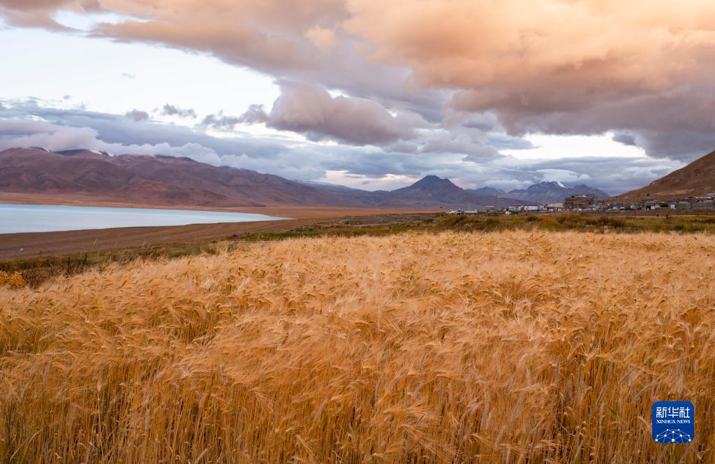 9月23日在西藏那曲市尼瑪縣文部鄉(xiāng)文部南村拍攝的金色的青稞和雪山湖泊。新華社記者 晉美多吉 攝