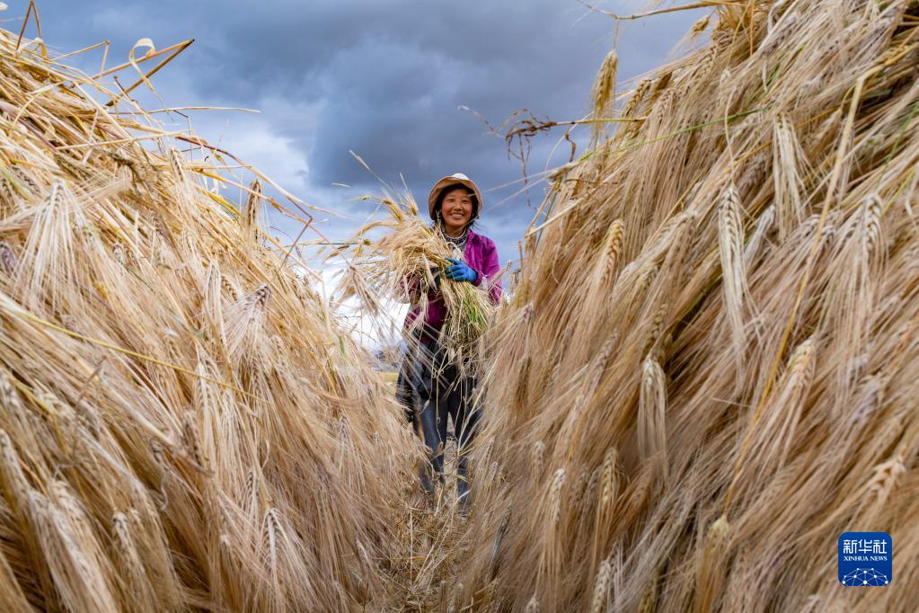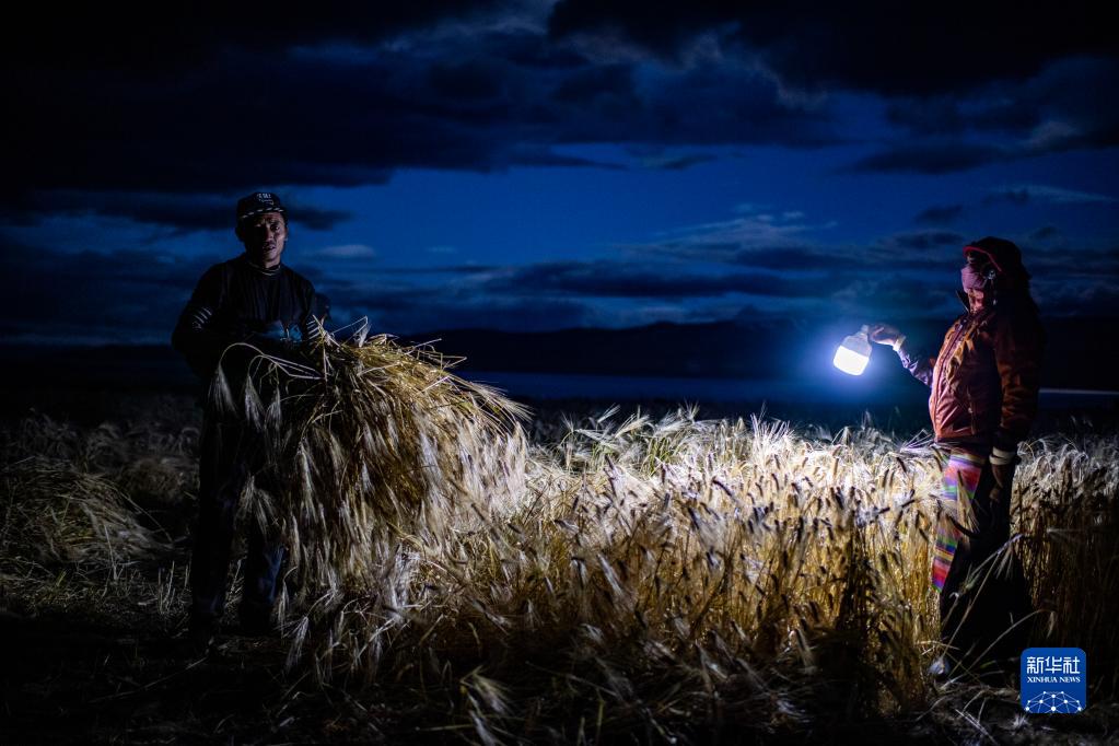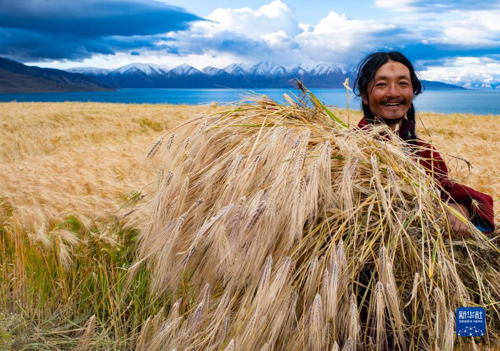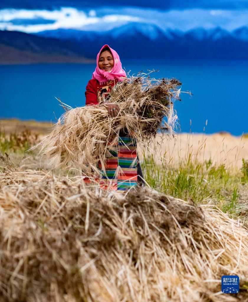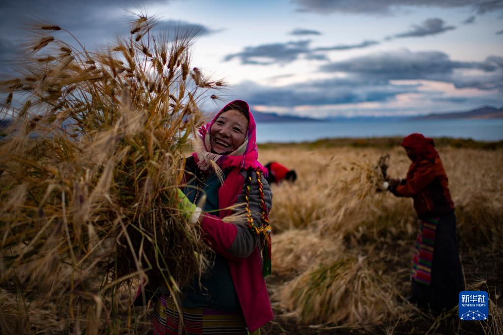 當(dāng)日,西藏那曲市尼瑪縣文部鄉(xiāng)文部南村村民開鐮收割農(nóng)田里的青稞。文部鄉(xiāng)文部南村位于當(dāng)惹雍措湖畔,海拔4645米,這里的村民以“薩馬卓”(半農(nóng)半牧之意)為主,在藏北高原獨(dú)具特色。