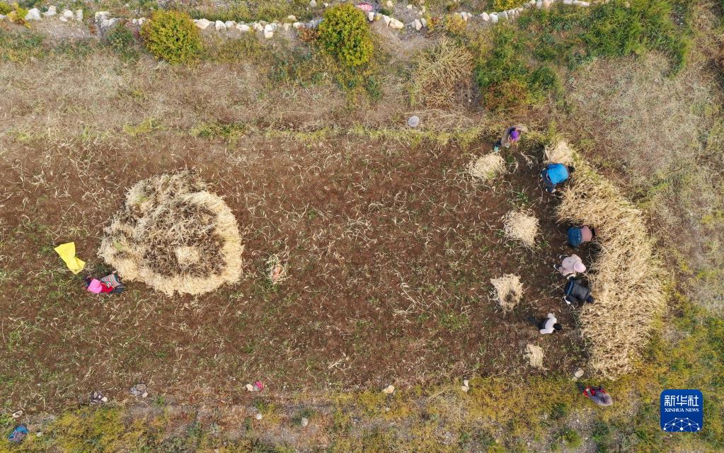 9月23日清晨,西藏那曲市尼瑪縣文部鄉(xiāng)文部南村村民開鐮收割(無人機(jī)照片)。新華社記者 晉美多吉 攝