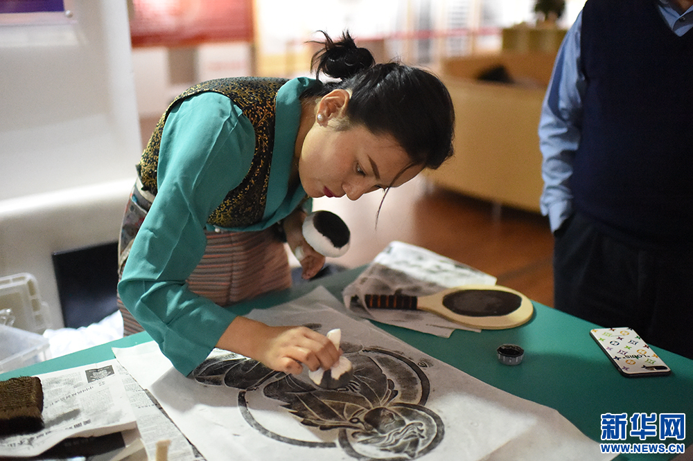 9月29日,在西藏大學(xué)新校區(qū)圖書(shū)館,日喀則石刻藝術(shù)博物館專業(yè)傳拓員德吉白珍演示拓片制作過(guò)程。新華網(wǎng) 旦增努布 攝