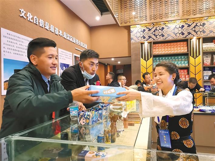 在青稞產(chǎn)品展銷區(qū),工作人員向前來(lái)參觀的客人推銷青稞產(chǎn)品。扎西頓珠 攝