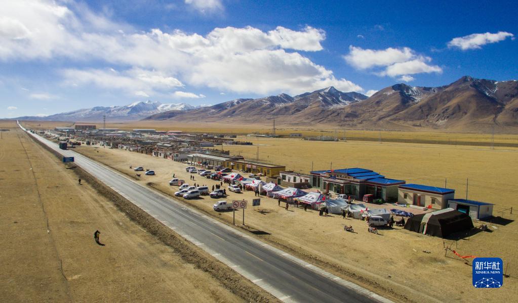 這是在青藏公路旁搭建的那曲縣香茂鄉(xiāng)畜產(chǎn)品展銷會(2017年11月25日攝,無人機(jī)照片)。新華社記者 劉東君 攝