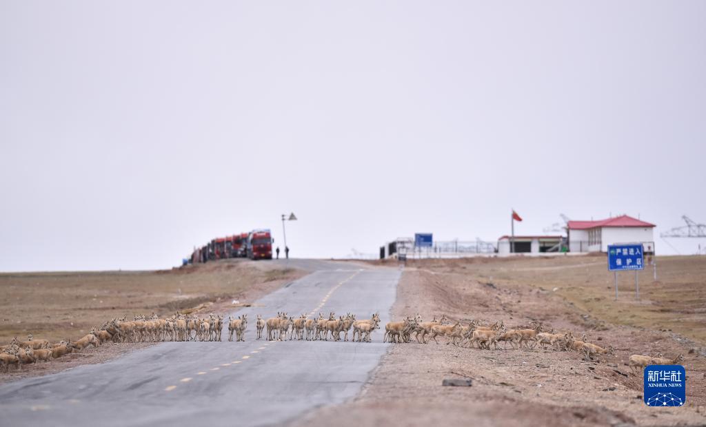 在青海可可西里,一群雌性待產(chǎn)藏羚羊正在通過青藏公路(2016年6月7日攝)。新華社記者 吳剛 攝