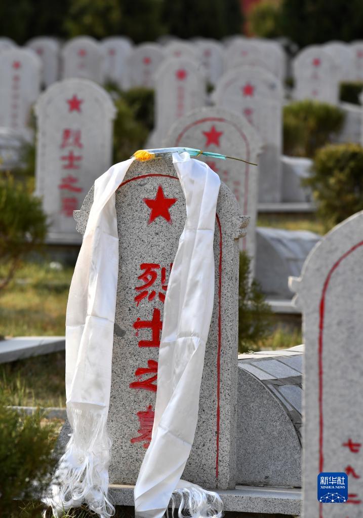 在西藏拉薩烈士陵園,一條潔白的哈達(dá)掛在烈士墓碑上(4月4日攝)。新華社記者 覺(jué)果 攝