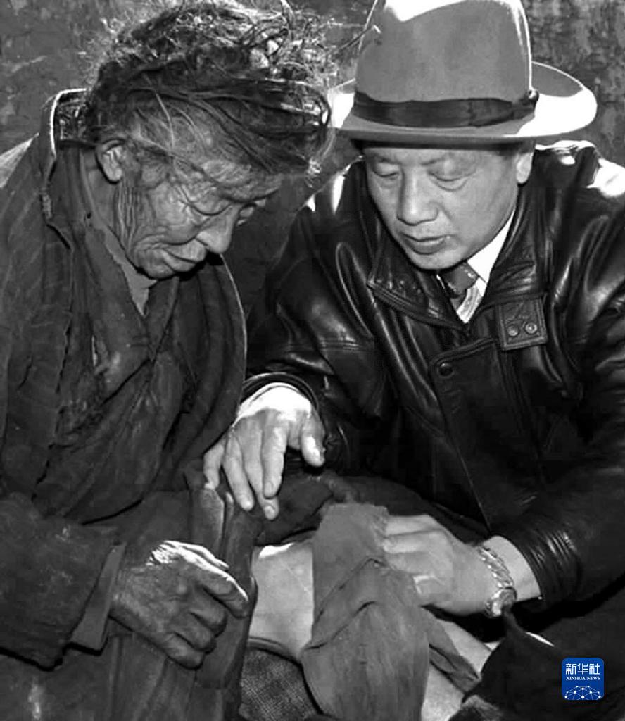 孔繁森(右)在西藏阿里日土縣過(guò)巴鄉(xiāng)看望孤寡老人益西卓瑪(資料照片)。新華社發(fā)