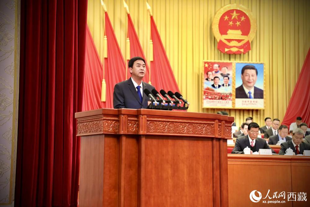 西藏自治區(qū)人民政府代理主席嚴(yán)金海向大會作政府工作報(bào)告。人民網(wǎng) 次仁羅布攝