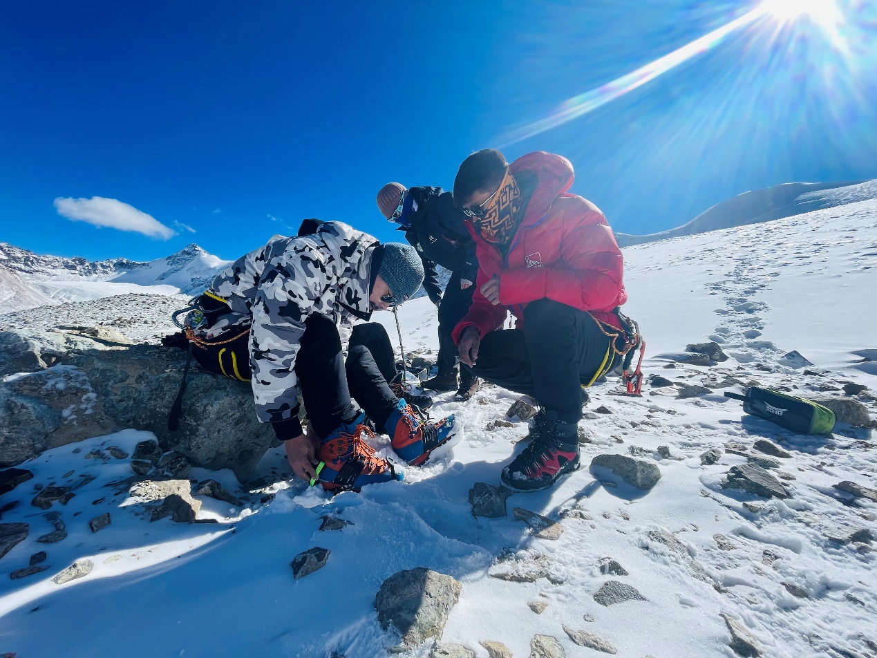 抵達(dá)洛堆峰5600米雪線的位置,三位二十歲出頭的年輕人熟練地在積雪冰壁上打起冰錐,固定路繩,他們?cè)诮o這些遠(yuǎn)道而來的體驗(yàn)者設(shè)置技能訓(xùn)練路線。