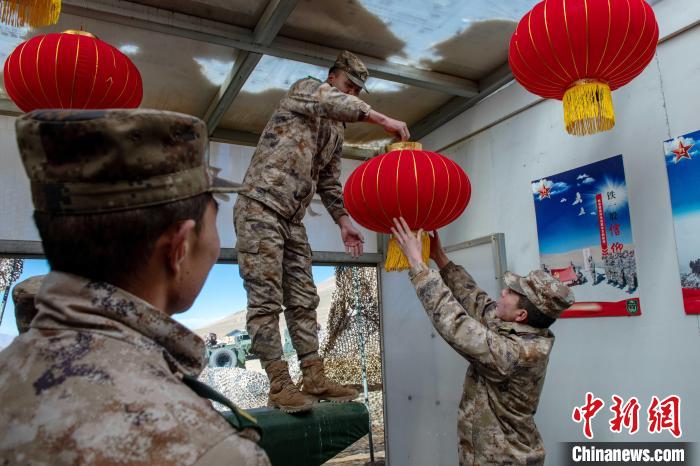 圖為官兵裝點(diǎn)布置營區(qū),營造春節(jié)氛圍?!⊥跏鰱| 攝