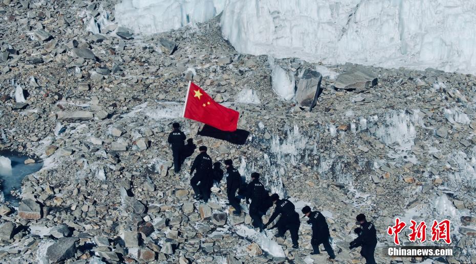 圖為普瑪江塘邊境派出所移民管理警察在邊境冰川巡邏期間向國旗敬禮。 索朗次旺 攝