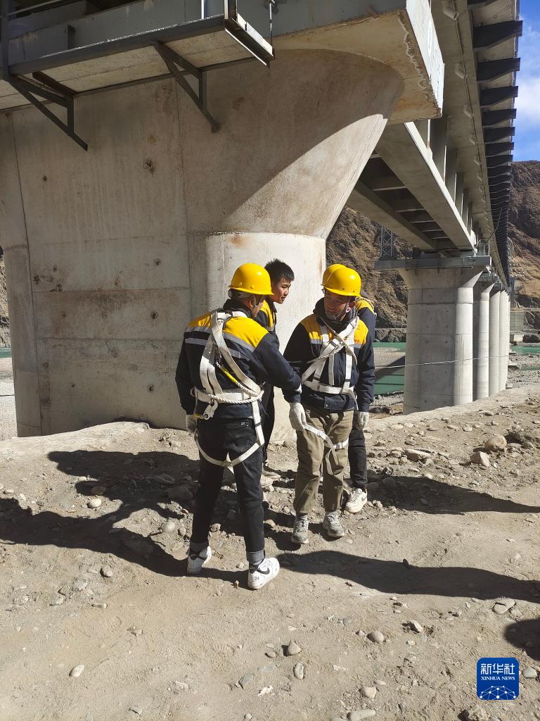 冷達(dá)2號雅魯藏布江特大橋橫跨雅魯藏布江?!?0后”橋隧工趙浩澤穿著亮黃色安全馬甲,系好安全帶,開始檢查抗震樁、支座和支撐墊石的情況。