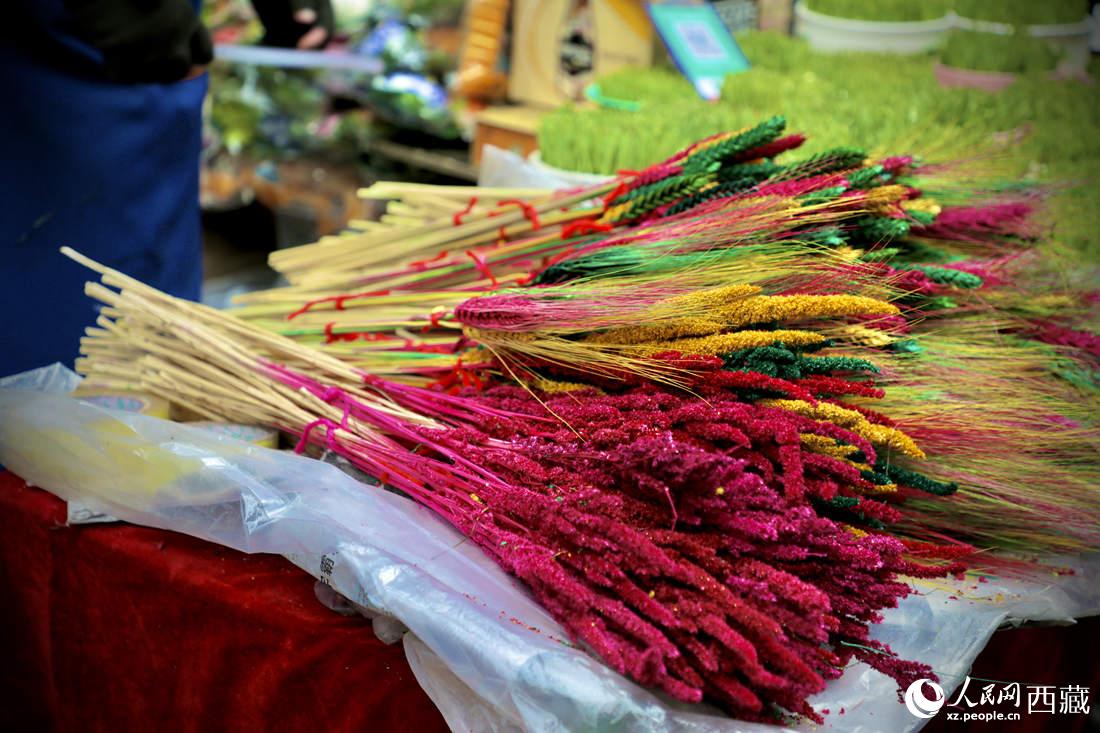 八廓商城一角售賣(mài)的 “羅薩美朵”。(每年的藏歷新年,家家戶戶的切瑪盒里都要插上 “羅薩美朵”,代表著溫馨的家庭里有著幸福的祝愿,承載著歡樂(lè)的故土上,能夠五谷豐登的期盼。)人民網(wǎng) 次仁羅布攝