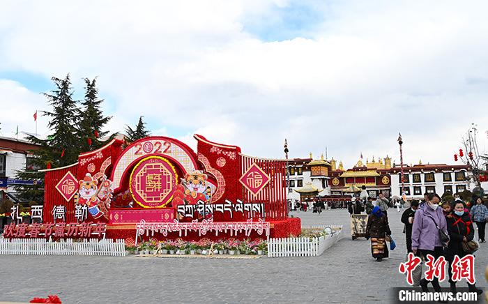 2月26日,人們經(jīng)過(guò)大昭寺廣場(chǎng)擺放著的慶祝新年裝置。隨著藏歷新年日益臨近,拉薩街頭年味濃郁。 中新社記者 趙朗 攝