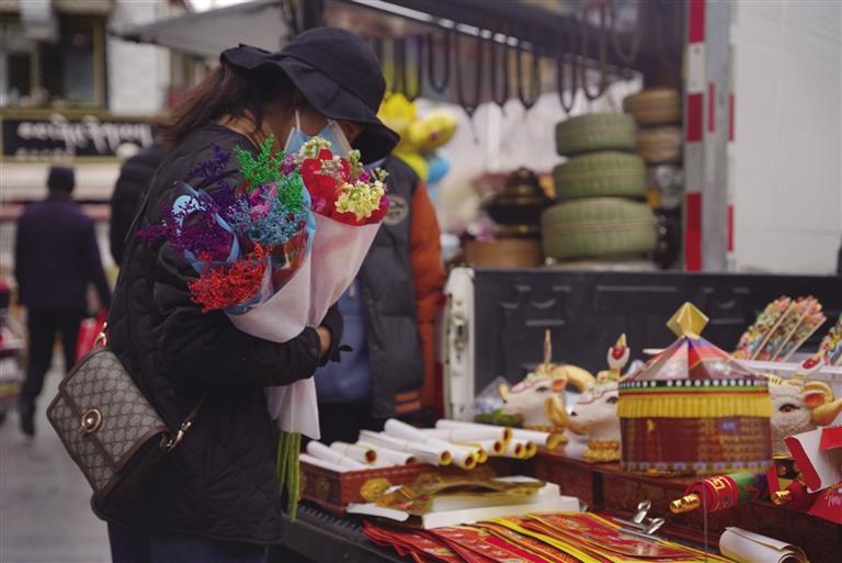 千門萬戶曈曈日,總把新桃換舊符。隨著各民族交往交流交融,藏文對聯(lián)也逐漸成為藏歷新年年貨市場中不可缺少的“成員”,寄托了人們對來年美好生活的殷切期盼。走進(jìn)沖賽康市場,記者看到很多攤位都擺放著各式各樣紅色藏式對聯(lián),內(nèi)容主要蘊(yùn)含平安、健康、長壽等吉祥的寓意,不時還有市民前來詢價(jià)選購。此外,每年藏歷新年前,不少書法家還會將滿載祝福的對聯(lián)寫好后送給市民,把濃濃的年味和對藏歷新年的祝福送到大家手中。