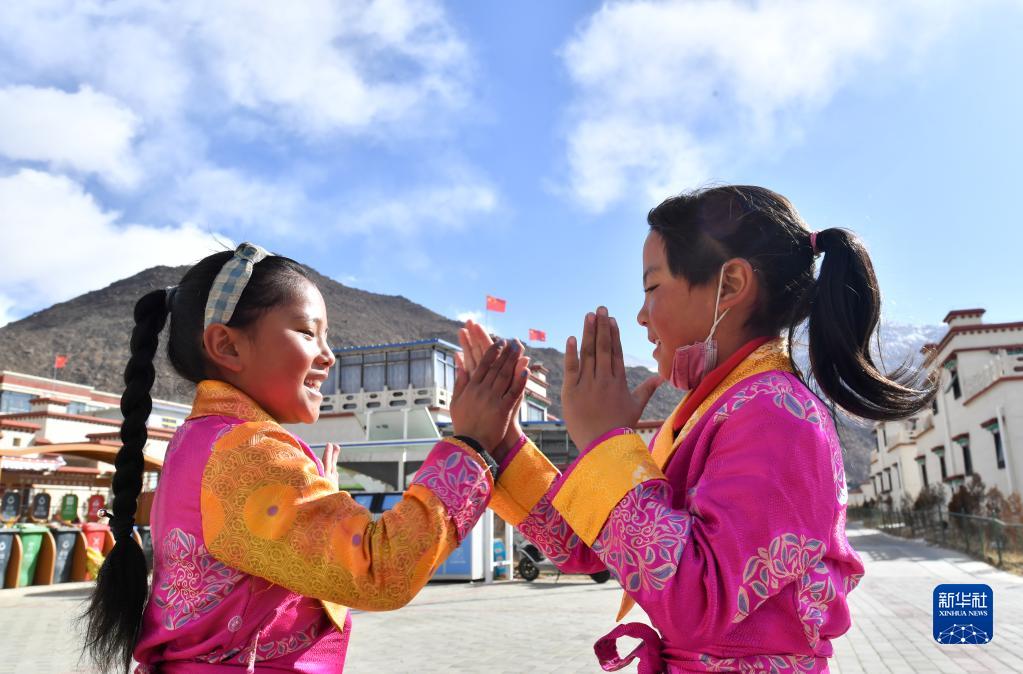 兩位搬遷牧民家的小姑娘穿上盛裝,在榮瑪高海拔生態(tài)搬遷點(diǎn)做游戲(2月28日攝)。新華社記者 覺(jué)果 攝