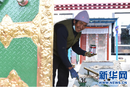 2月23日,曲水縣三有村村民旺堆在自家門上刷漆。新華網(wǎng) 旦增努布 攝
