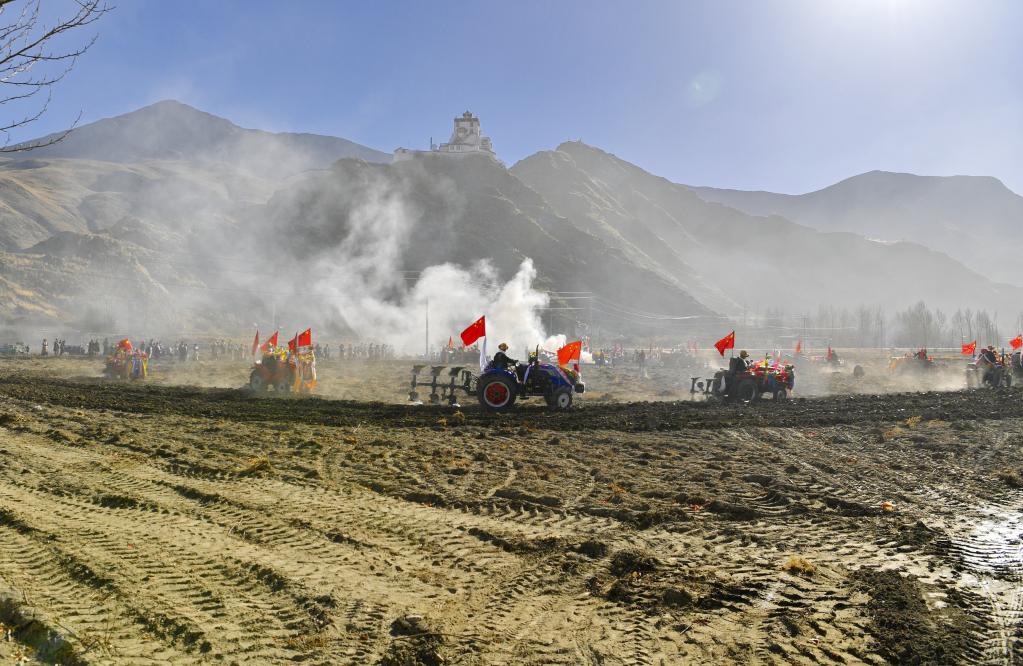 日頭漸高,春耕儀式準(zhǔn)備就位。門中崗社區(qū)黨總支書記央金卓嘎說:“開耕嘍!”頓時(shí),14臺(tái)拖拉機(jī)發(fā)出隆隆轟鳴聲,肥沃的田地被犁出一道道深深的壟溝。