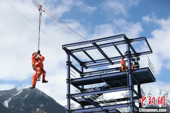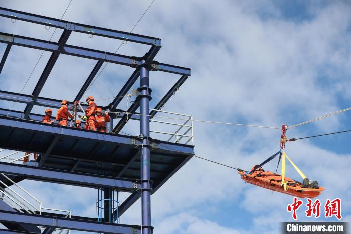 圖為消防指戰(zhàn)員利用橫渡系統(tǒng)轉(zhuǎn)運傷員?!×种ナ猩窒乐ш?攝