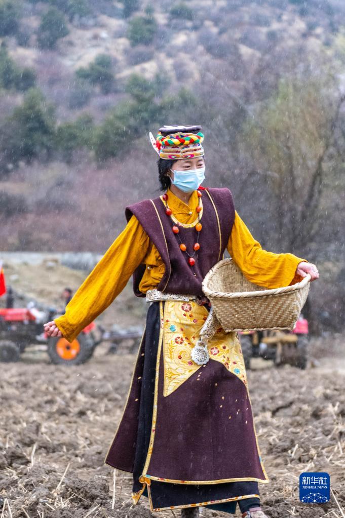 只見(jiàn)仁增旺姆手里端著裝滿青稞的竹筐,向田間撒下希望的種子。春耕隊(duì)伍跟隨在她的身后,肥沃的土地被犁出一道道深深的壟溝。