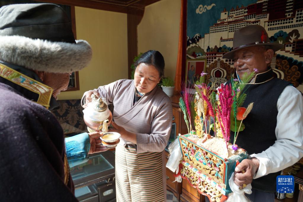 這是拉旺的二兒子索朗多布杰在弟弟多吉家被敬切瑪(2022年3月15日攝)。新華社記者 白少波 攝