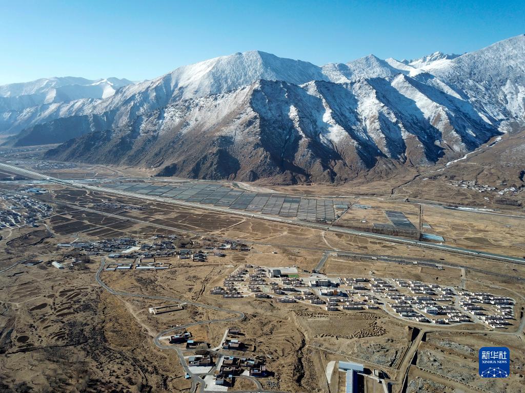 這是拉薩市堆龍德慶區(qū)古榮鎮(zhèn)榮瑪高海拔生態(tài)搬遷點的全景,高速公路、國道、鄉(xiāng)村道路使搬遷點與外面的世界連接通暢(無人機(jī)照片,2月28日攝)。新華社記者 姜帆 攝