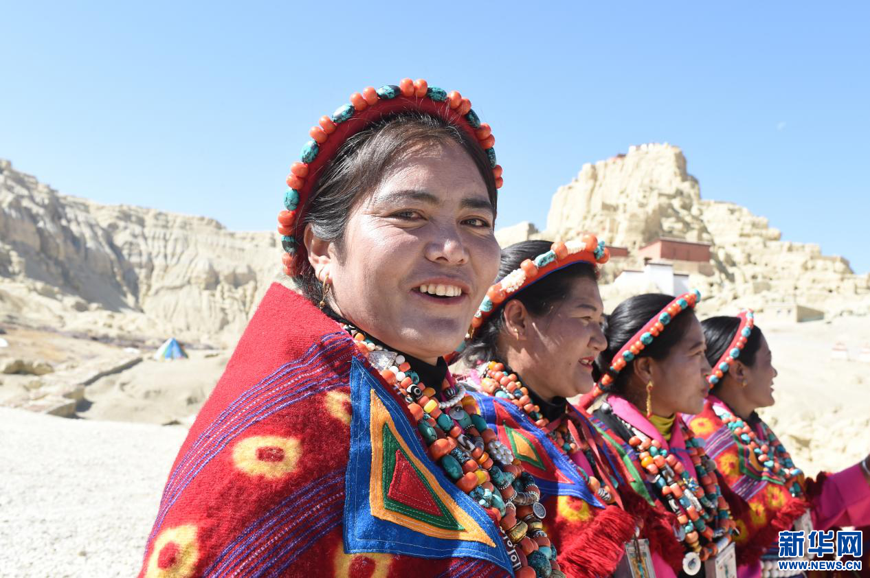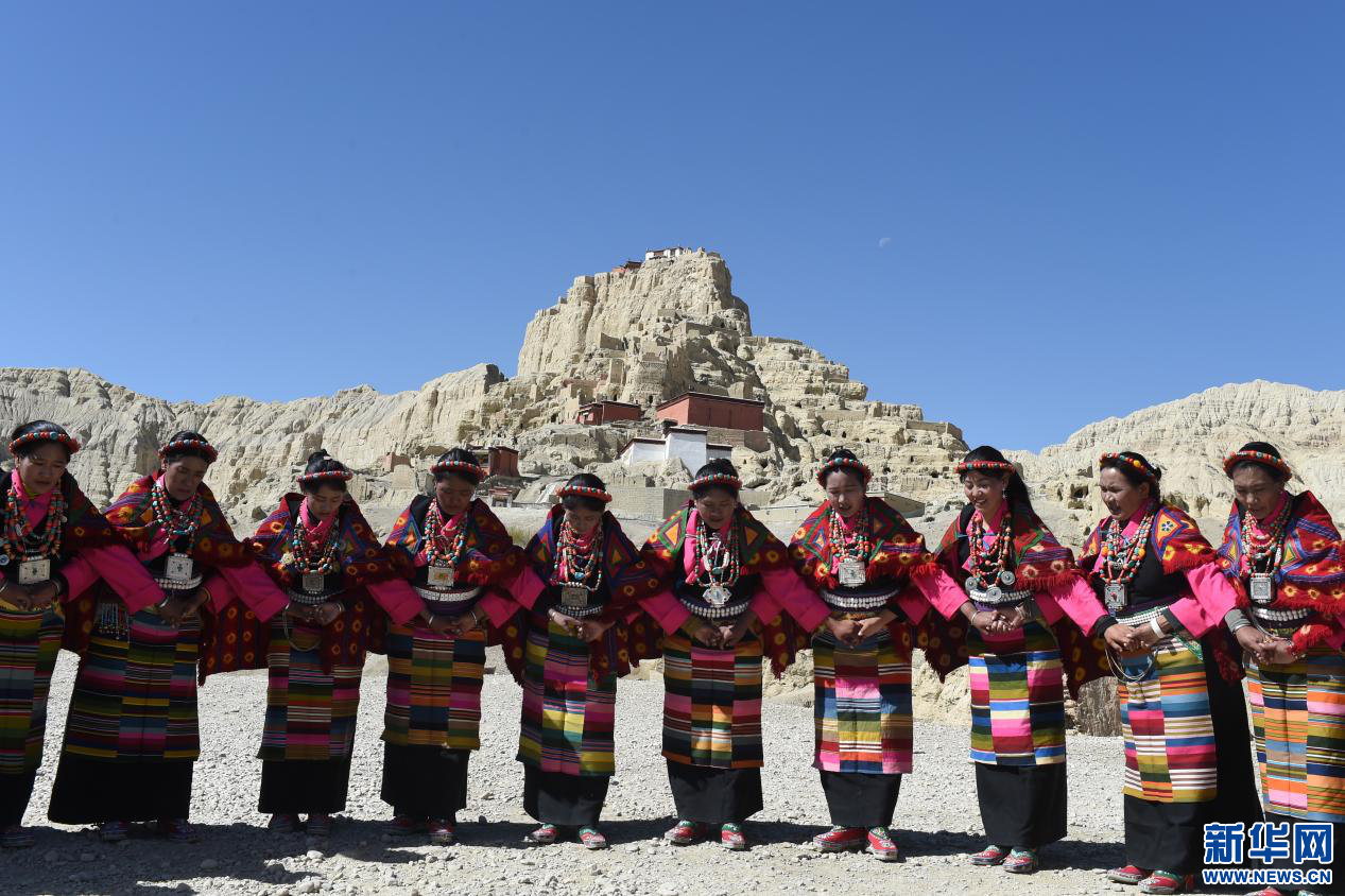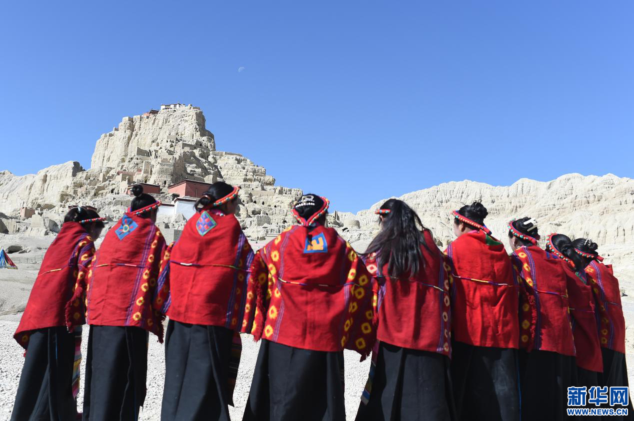 圖為當?shù)厝罕娫诠鸥裢醭z址腳下準備表演宣舞(4月23日攝)。新華網(wǎng) 旦增努布攝