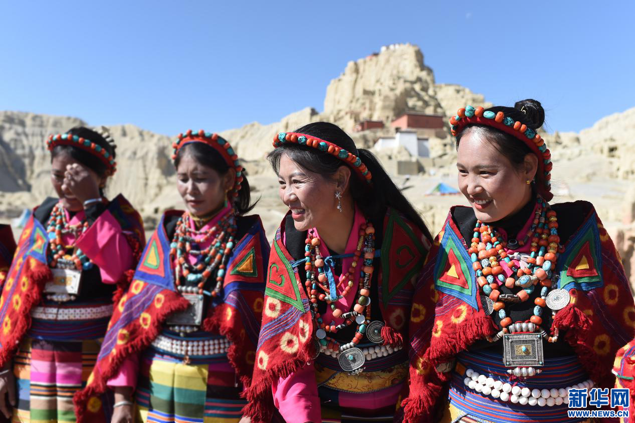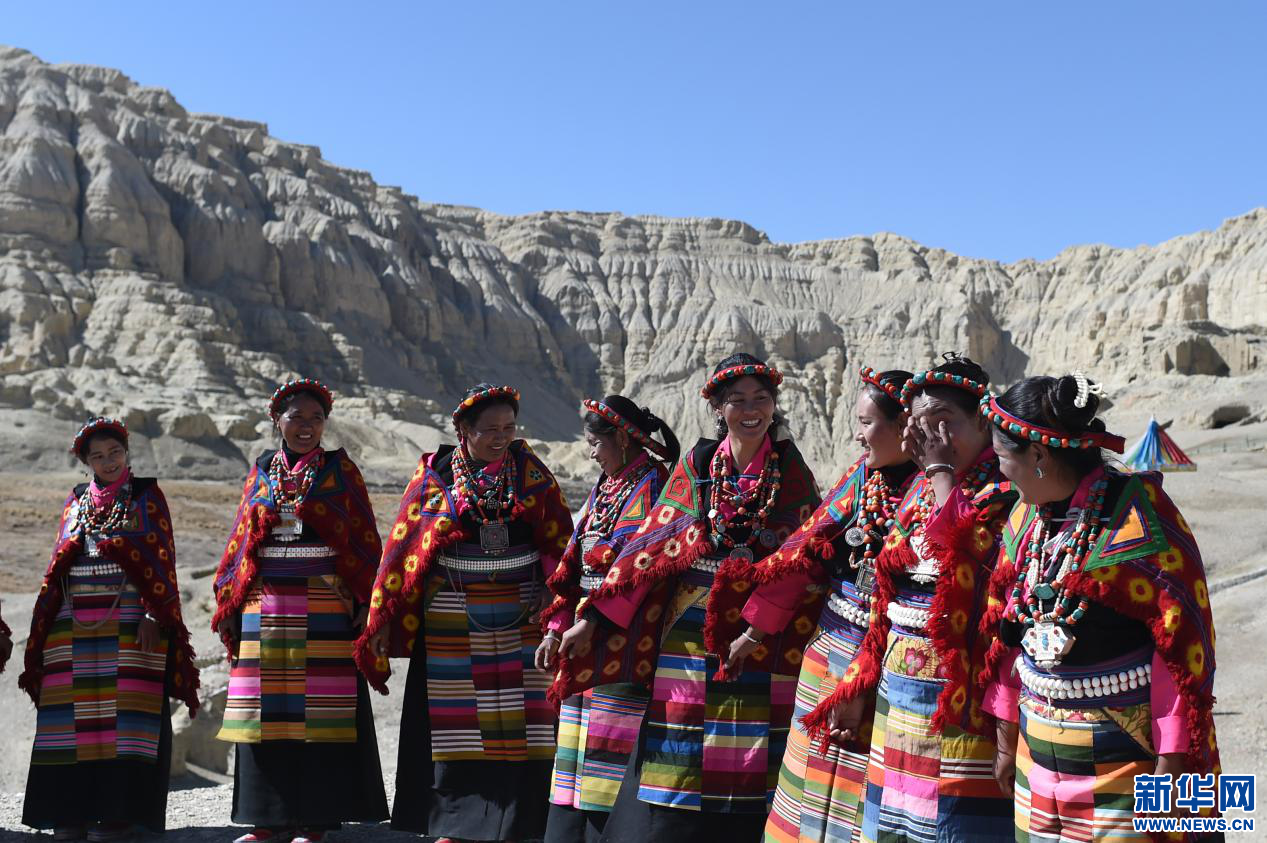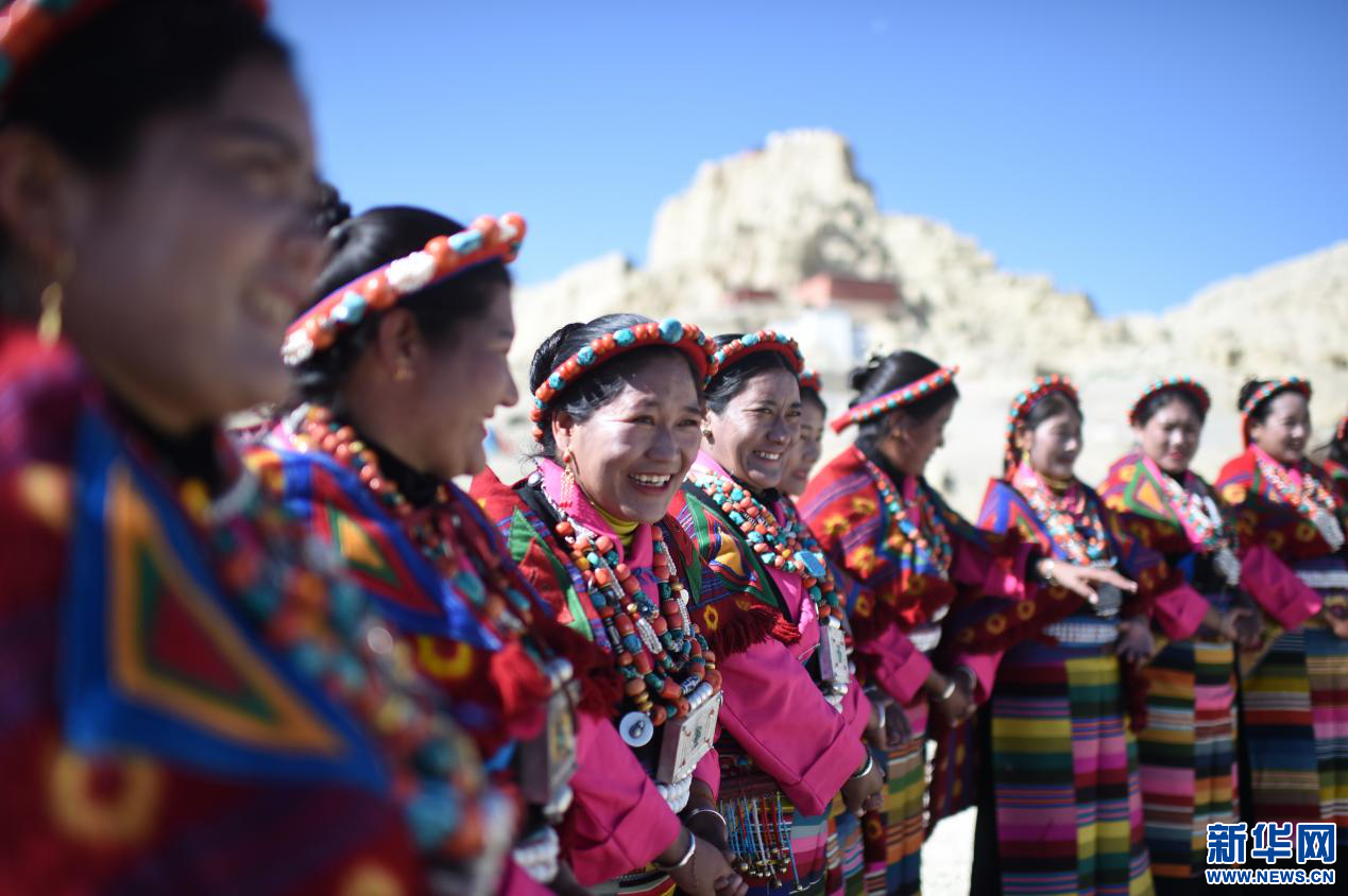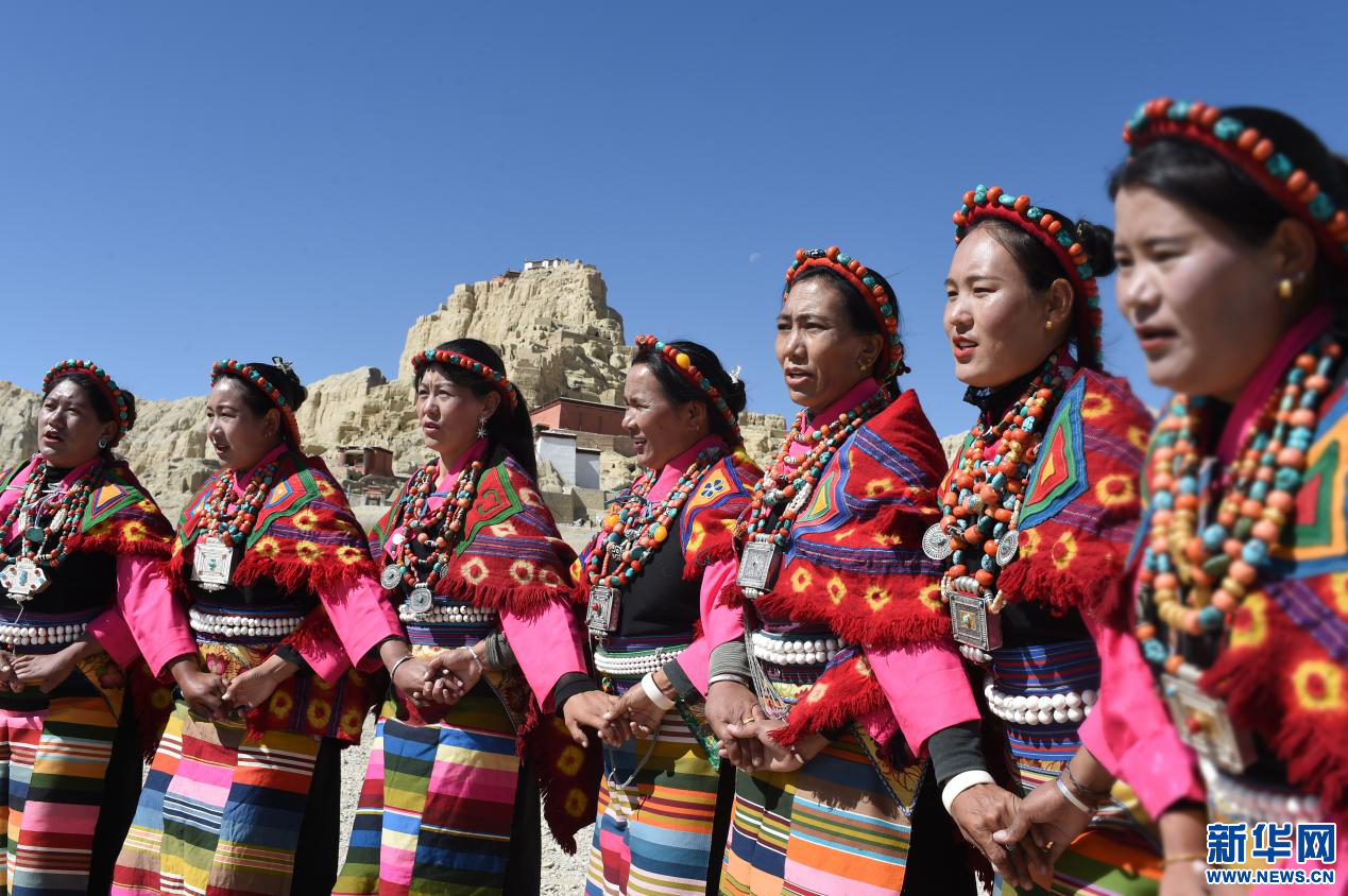 圖為當?shù)厝罕娫诠鸥裢醭z址腳下準備表演宣舞(4月23日攝)。新華網(wǎng) 旦增努布攝
