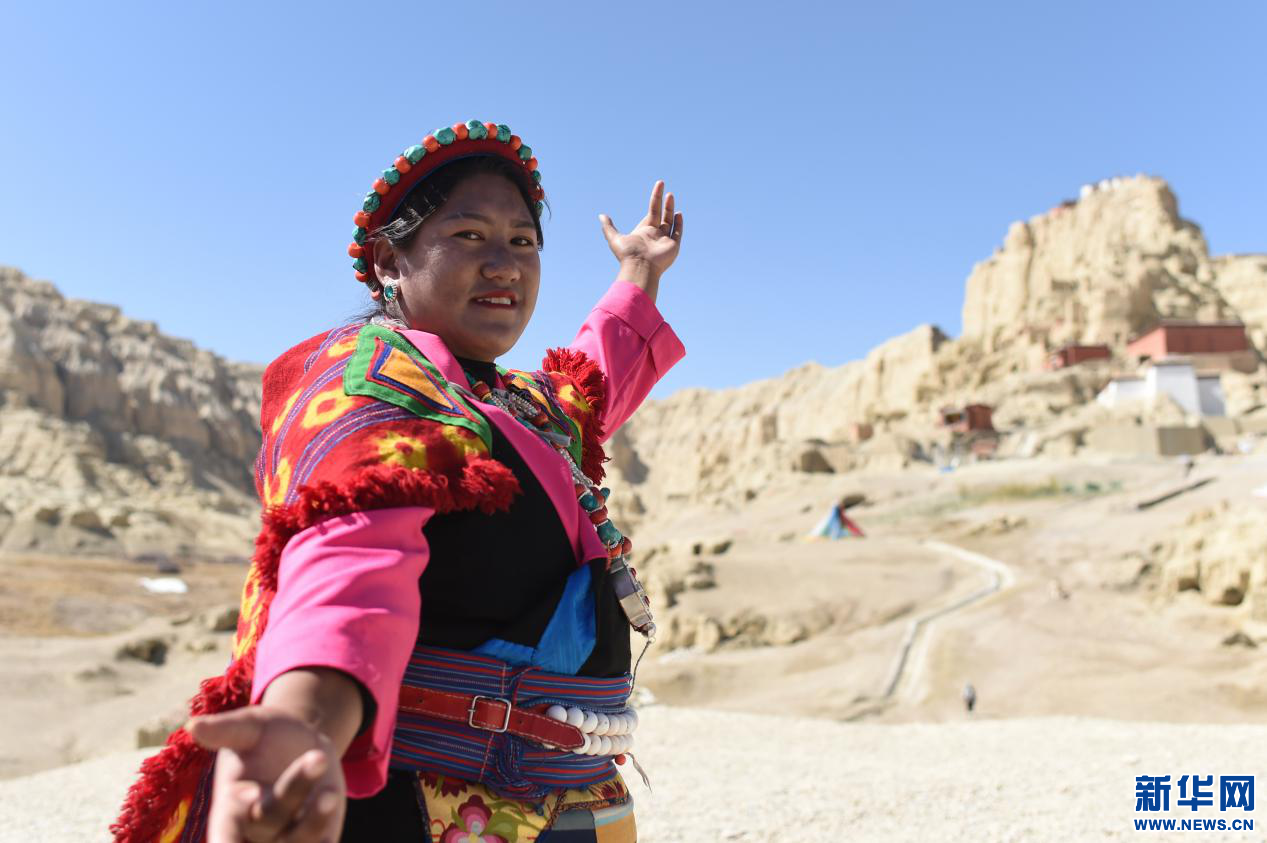 4月23日,一名當?shù)厝罕娫诠鸥裢醭z址腳下表演宣舞。新華網(wǎng) 旦增努布攝