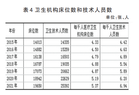 年末全區(qū)共有衛(wèi)生機構1650個。其中,醫(yī)院179個,鄉(xiāng)(鎮(zhèn))衛(wèi)生院675個,社區(qū)衛(wèi)生服務中心(站)14個,疾病預防控制中心82個,婦幼保健院(站)36個。醫(yī)療衛(wèi)生機構實有床位數(shù)19650張。其中醫(yī)院14808張。衛(wèi)生技術人員25392人。其中執(zhí)業(yè)(助理)醫(yī)師10448人。每千人醫(yī)療衛(wèi)生機構床位數(shù)5.37張。每千人衛(wèi)生技術人員數(shù)6.94人。每千人執(zhí)業(yè)(助理)醫(yī)師數(shù)2.85人。