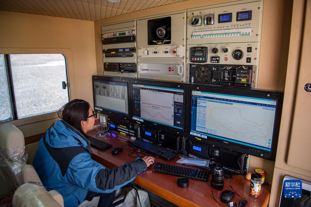 在珠峰登山大本營(yíng)的氣象應(yīng)急保障車內(nèi),西藏自治區(qū)氣象局工作人員在查看實(shí)時(shí)氣象數(shù)據(jù)(5月3日攝)。新華社記者 孫非 攝