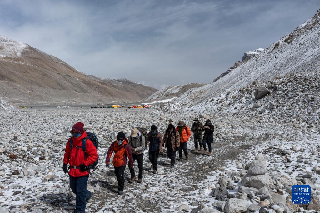 朱彤(右一)和科研人員在珠峰大本營和東絨布冰川間徒步穿梭(5月1日攝)。新華社記者 姜帆 攝