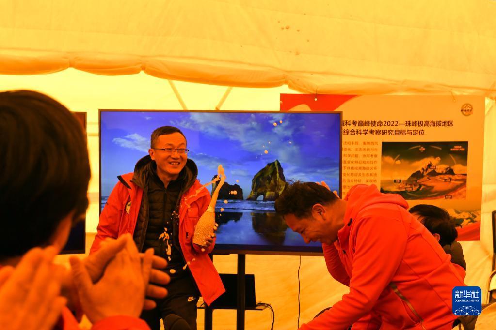 在珠峰腳下海拔5200米的總指揮會(huì)議室?guī)づ窭?,大家熱烈慶?!皫p峰使命”珠峰科考登頂觀測(cè)采樣成功(5月4日攝)。新華社記者 姜帆 攝