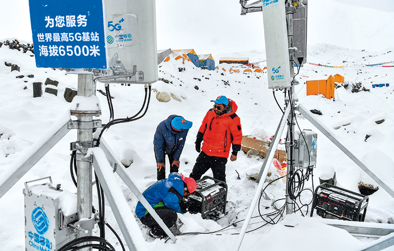 在海拔 6500 米的珠峰前進(jìn)營地,中國移動(dòng)工作人員在調(diào)試 5G 基站(2020 年 5 月 21 日攝) 晉美多吉 攝