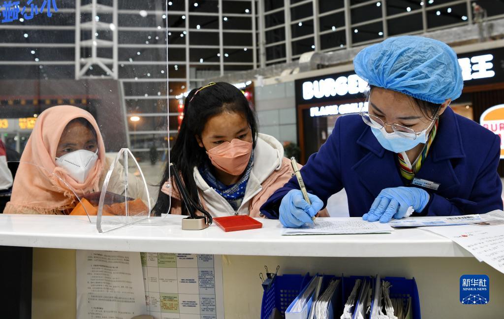 5月8日,在拉薩貢嘎機場候機樓,機場服務(wù)人員(右)為患兒和家人登記信息。新華社記者 張汝鋒 攝