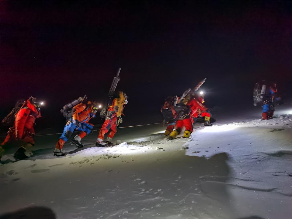 2022年5月4日凌晨,珠峰科考隊員從突擊營地出發(fā),向珠穆朗瑪峰峰頂發(fā)起沖刺。新華社特約記者 索朗多吉 攝