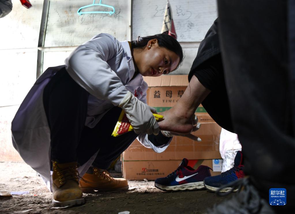 西藏那曲市比如縣良曲鄉(xiāng)然木塘村蟲草采集點的營地里,政府為采集點配備的醫(yī)護(hù)人員在給采集蟲草時受傷的牧民治療(5月26日攝)。新華社記者 晉美多吉 攝