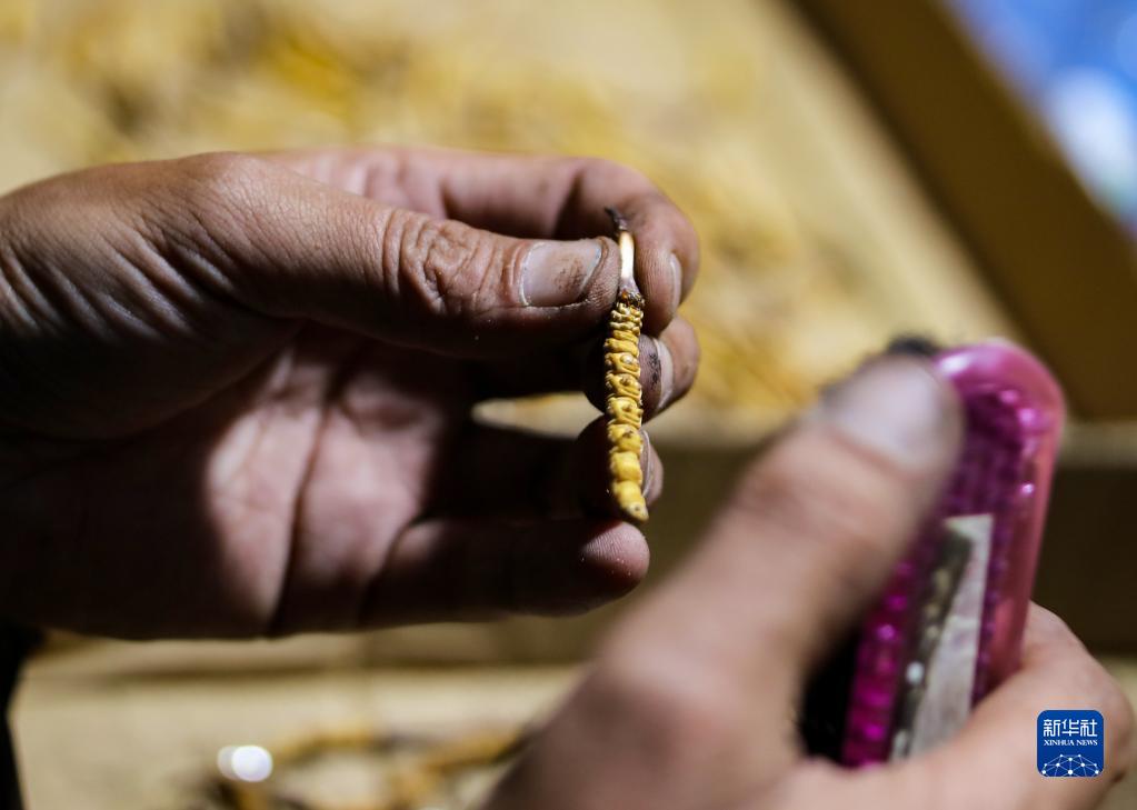 傍晚回到采集點營地后,牧民在用毛刷清理蟲草上的土(5月25日攝)。新華社記者 姜帆 攝