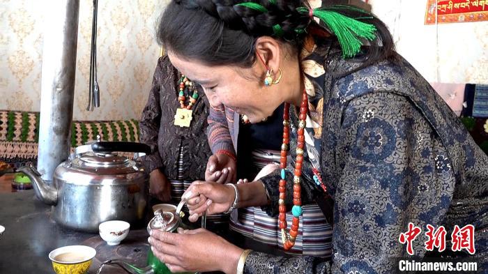 圖為小妹米瑪給來(lái)訪(fǎng)客人品嘗底雅鄉(xiāng)特色杏子酒。貢桑拉姆 攝