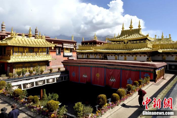 2014年10月拍攝的大昭寺金頂。大昭寺是西藏重大佛事活動的中心,“噶廈”政府的機構(gòu)設(shè)于寺內(nèi)。許多重大的政治、宗教活動,如“金瓶掣簽”等都在這里進行。中新社記者 李林 攝