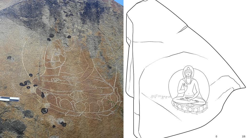 自治區(qū)文物保護(hù)研究所研究員夏格旺堆說,這一石刻造像群造像技法皆為陰線刻,雕工技術(shù)嫻熟,線條流暢。此外,部分石刻群區(qū)域不僅造像分布集中,而且在其周圍可見地面石砌建筑遺址,推測應(yīng)當(dāng)與早期佛教修行場相關(guān)。石刻群中,部分造型還反映出較為明顯的元代特征、吐蕃晚期或吐蕃分裂不久后的吐蕃遺風(fēng)。