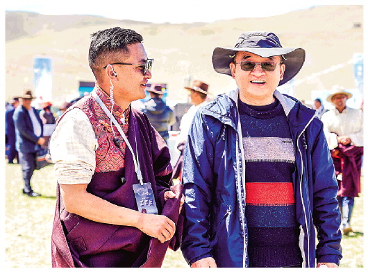 2021年7月,王軍強(右)在賽馬節(jié)上與索朗倫布談話。