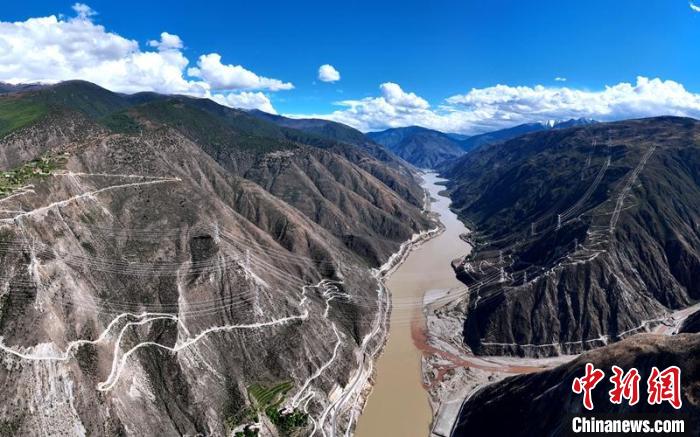 蘇洼龍水電站500千伏送出工程(中)與川藏聯(lián)網(wǎng)鏈路(兩側(cè))并行跨越金沙江大峽谷?!⑾驸C 攝
