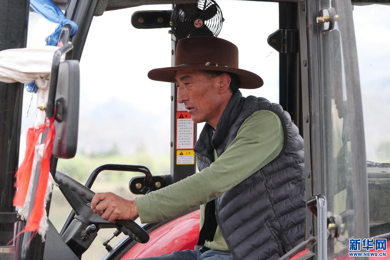 6月20日,甘曲鎮(zhèn)江角村農(nóng)機合作社負責人米瑪在駕駛農(nóng)機。新華網(wǎng) 旦增努布 攝